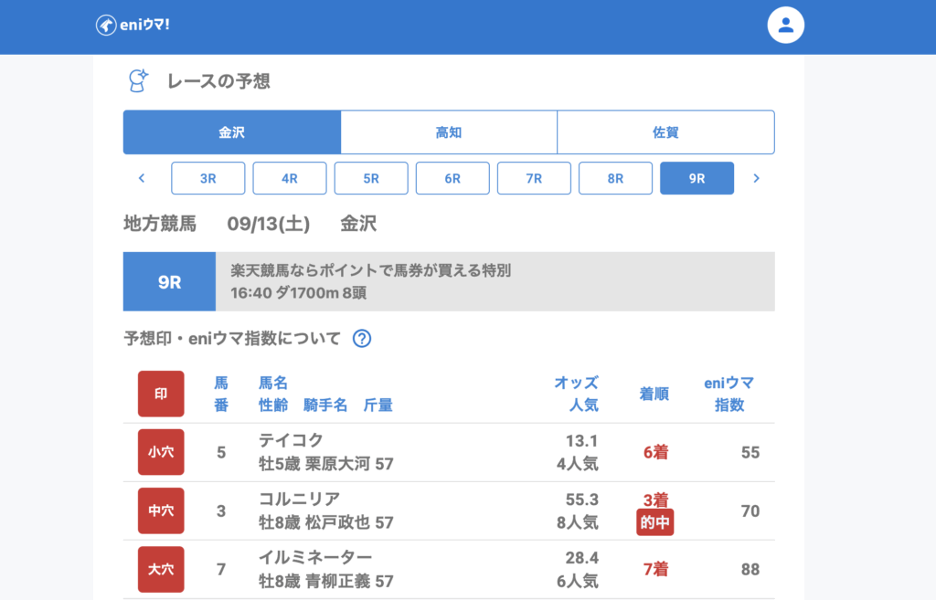 5Rウエスタンアミーゴ(8.4倍/eniウマ!指数80)の単勝、6Rスマートブリーズ(32.9倍/eniウマ!指数80)の3着、9Rコルニリア(55.3倍/eniウマ!指数70)の3着と、しっかり妙味を拾うことができました。