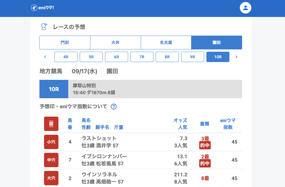 園田でも10Rでイプシロンナンバー(13.1倍/eniウマ!指数45)とラストショット(7.3倍/eniウマ!指数45)のダブル的中があり、一定の成果を残しています。