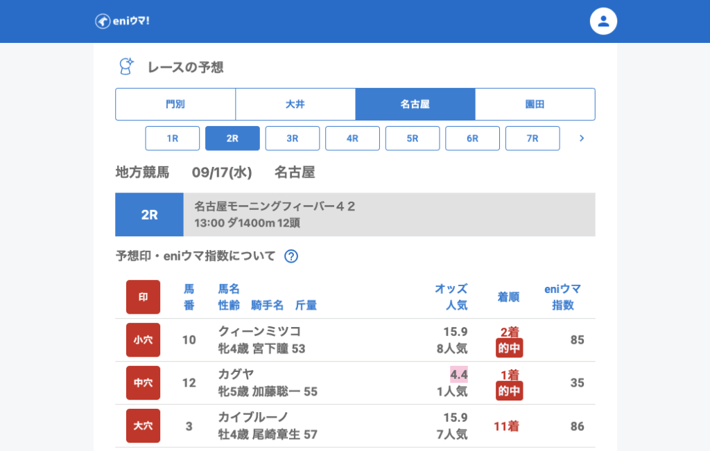 名古屋では2Rでカグヤとクィーンミツコ(15.9倍/eniウマ!指数45)のダブル的中。