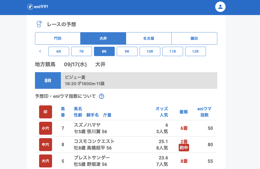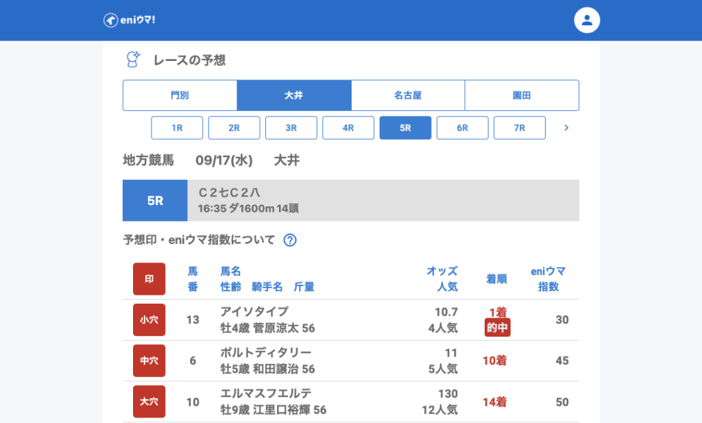 大井では5Rでアイソタイプ(10.7倍/eniウマ!指数30)が単勝的中。