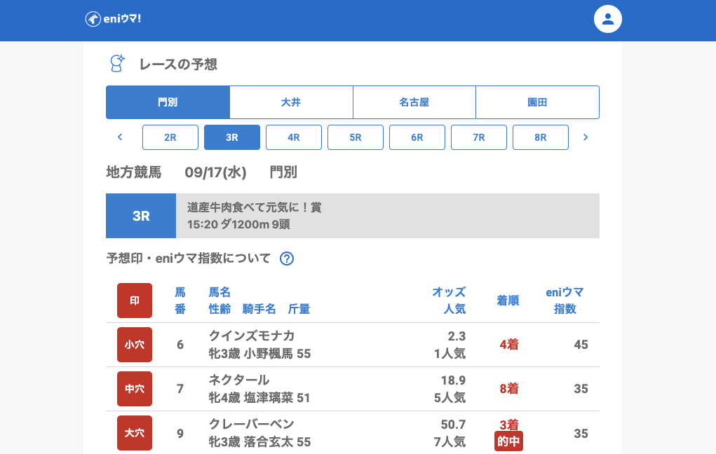 門別では3Rでクレーバーベン(50.7倍/eniウマ!指数70)が3着。