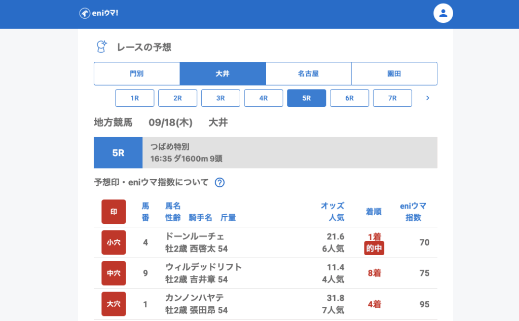 大井では5Rでドーンルーチェ(21.6倍/指数70)が単勝的中。