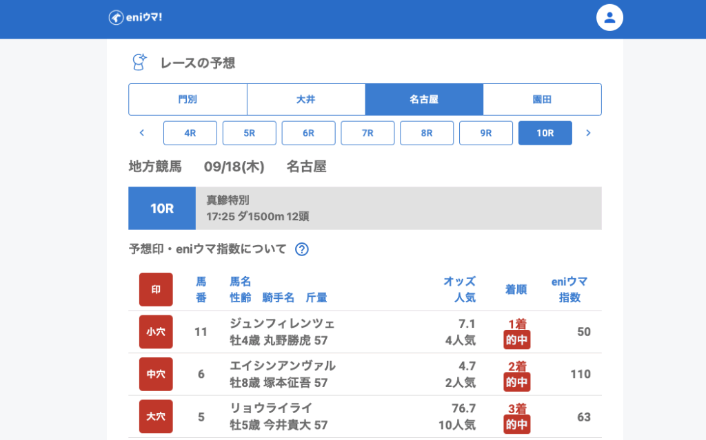 名古屋は序盤から好調で、1Rからダブル的中、2R・3Rも連続的中と良いスタートを切りました。さらに6Rでもダブル的中を記録し、10Rでは上位人気3頭が飛ぶ波乱の展開で小・中・大穴すべてを的中するなど、会場全体で見ても特に好成績を収めています。