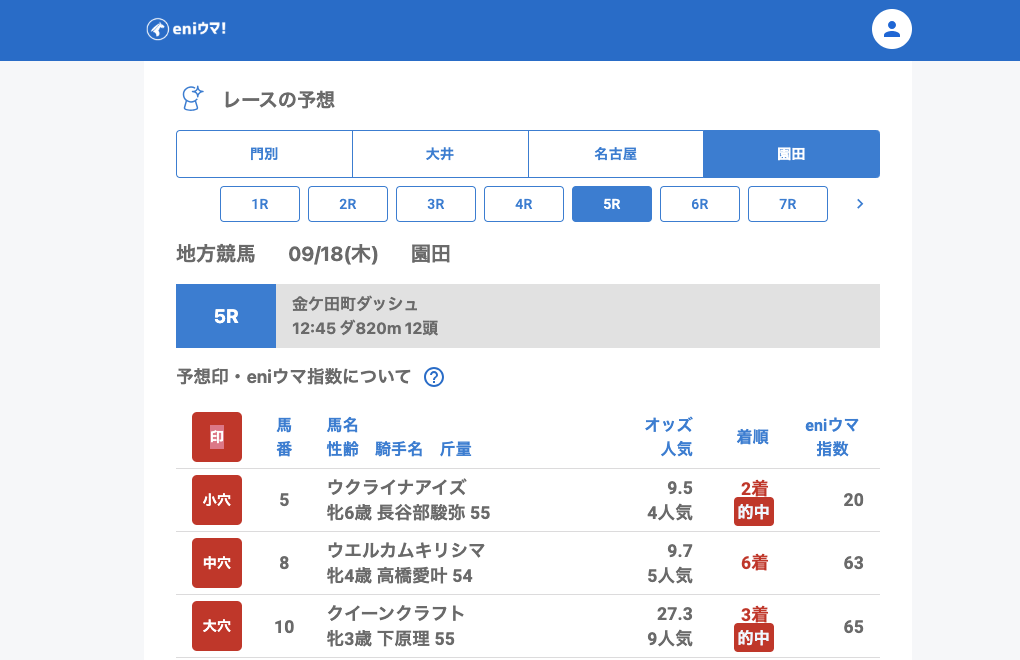2Rではダブル的中、特に大穴ピオニー(50.6倍/指数90)が3着に入りました。さらに3R・7Rでもダブル的中を記録し、12Rフローラルカップではニジコ(6.9倍/指数50)が単勝的中。