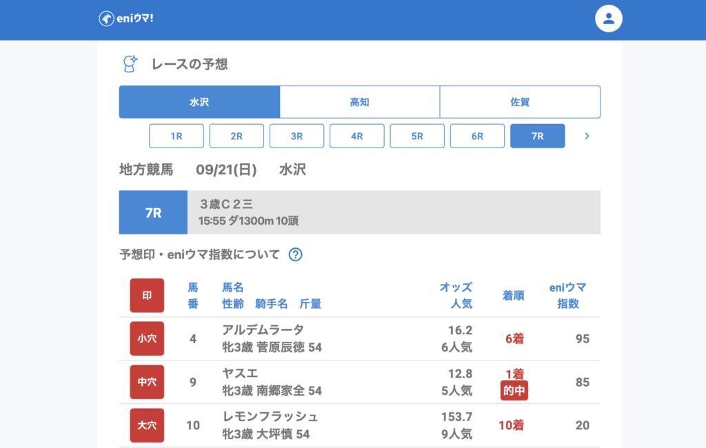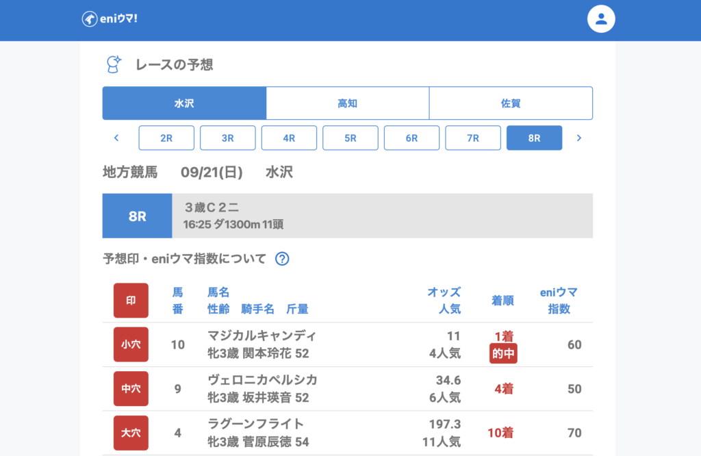 水沢では単勝的中が3本。ヤスエ(12.8倍/指数85)、マジカルキャンディ(11.0倍/指数60)、クリノブリーゼ(4.1倍/指数78)をしっかり仕留め、安定感のある結果となりました。さらに11Rではシンヨモギネス(22.9倍/指数70)が3着と健闘しましたが、全体的に妙味はやや控えめでした。