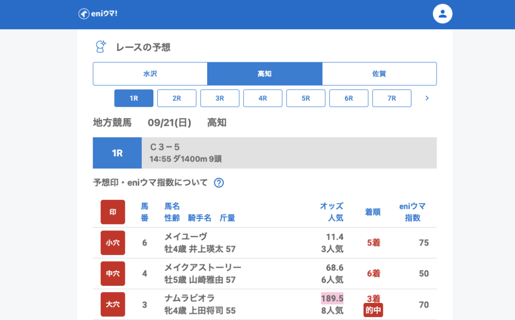 高知では序盤から波乱の立役者を発見。1Rでナムラビオラ(189.5倍/指数70)が3着、3Rでもイエスゴーオン(73.0倍/指数53)が3着と大穴を的中。加えてドンカルロ(15.4倍/指数70)やウキヨノユメ(12.0倍/指数110)なども結果を残しています。