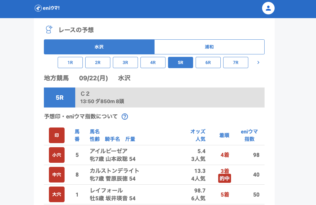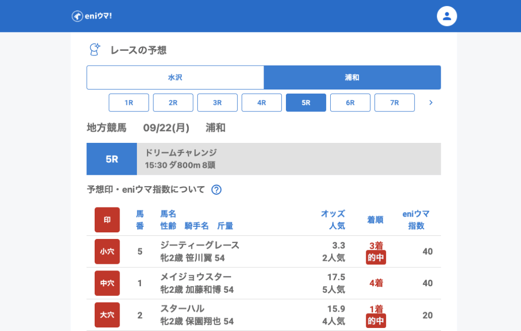 一方の浦和では序盤から的中が続出。1Rではアミン(25.4倍/指数85)が2着、2R・3Rは少頭数ながら小穴・大穴のダブル的中。そして5Rではスターハル(15.9倍/指数20)が単勝を的中するなど、かなり好成績を残しました。