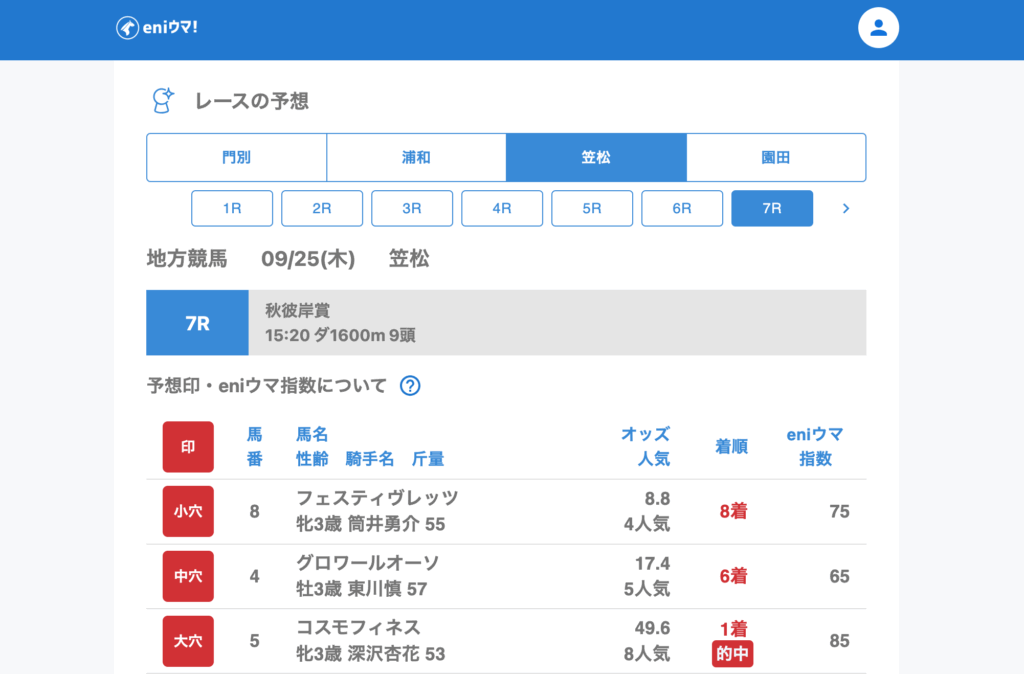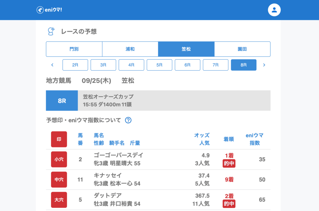 笠松競馬場は序盤から絶好調。ジーティーオウカ(18.5倍/eniウマ!指数30)、オセアジェネシス(29.7倍/eniウマ!指数100)、コスモフィネス(49.6倍/eniウマ!指数85)が単勝的中と、妙味ある的中が連続。さらにダットデア(367.5倍/eniウマ!指数65)が2着と超大穴の一撃も光りました。