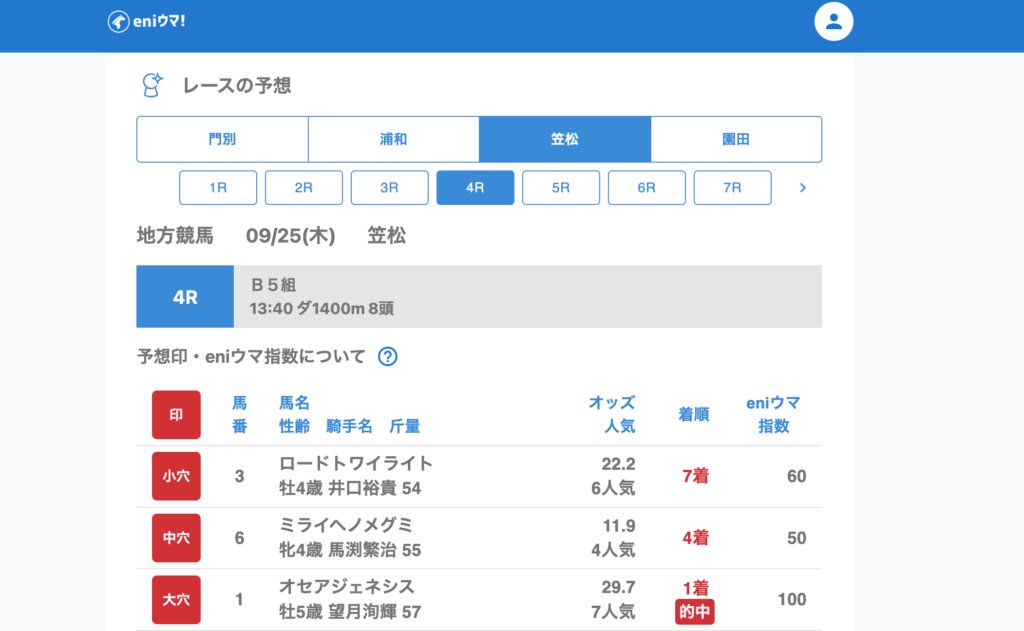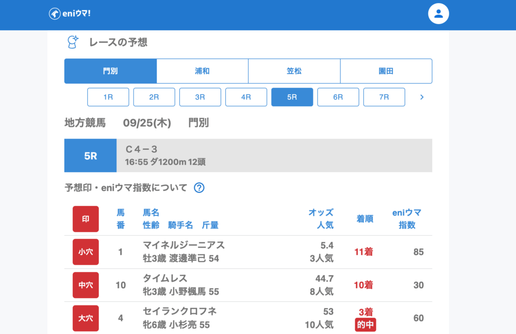 園田競馬場では1R目からミヤビルーナ(6.3倍)が単勝的中。その後3Rまで連続的中し流れを掴むと、フレイムフォース(53.8倍/eniウマ!指数60)やゴッドホーネット(22.1倍/eniウマ!指数50)など高配当の穴馬も発見できました。