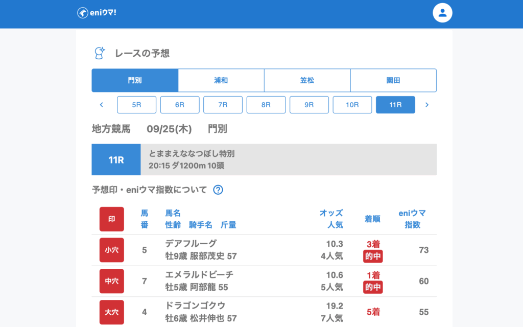 門別競馬場では12R中11R的中と高確率の好成績。前半は妙味が薄い的中が続きましたが、9〜11Rで連続単勝的中が出て、最終的にはしっかり結果がでました。
