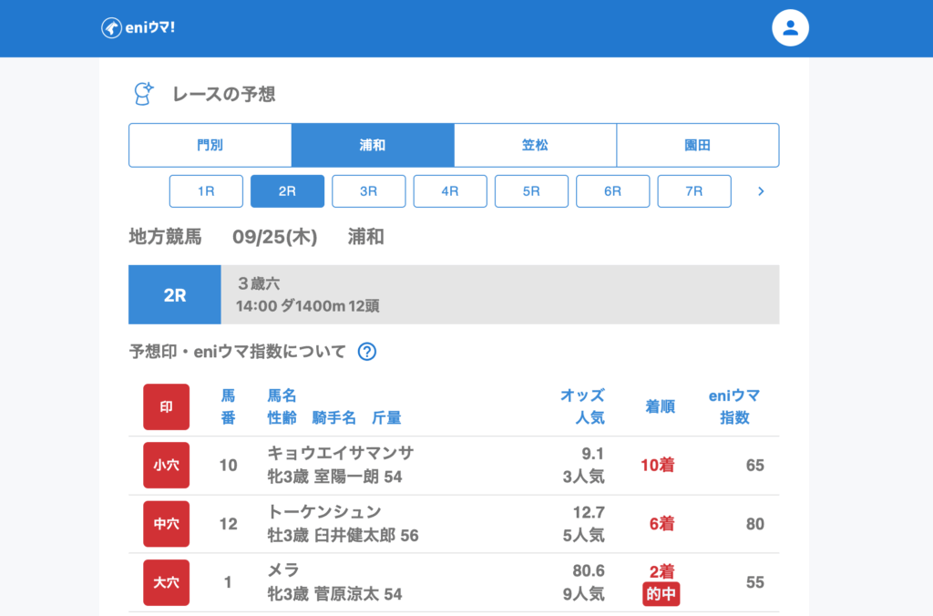 浦和競馬場では穴馬発見が後半に集中。2Rではメラ(80.6倍/eniウマ!指数55)が2着に入り大波乱を演出しましたが、勝ち馬の穴馬は惜しくも見逃す結果に。