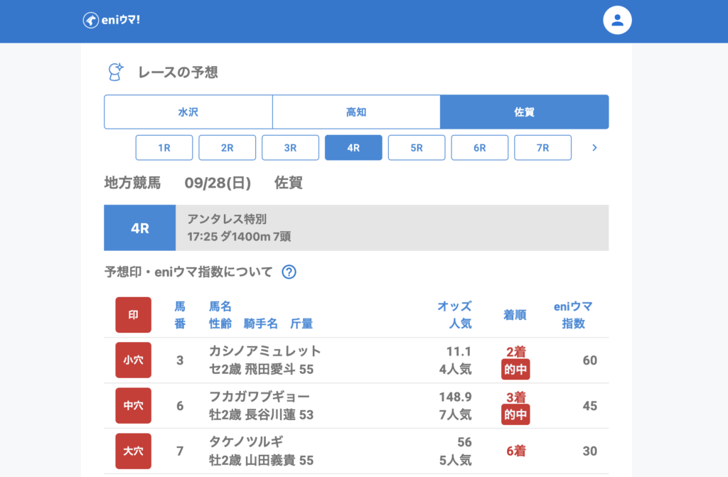 佐賀では中穴が4回的中。フカガワブギョー(148.9倍/指数45)が3着に激走し、キクノアーデント(14.6倍/指数60)も単勝的中。堅実さと妙味を両立した内容となりました。