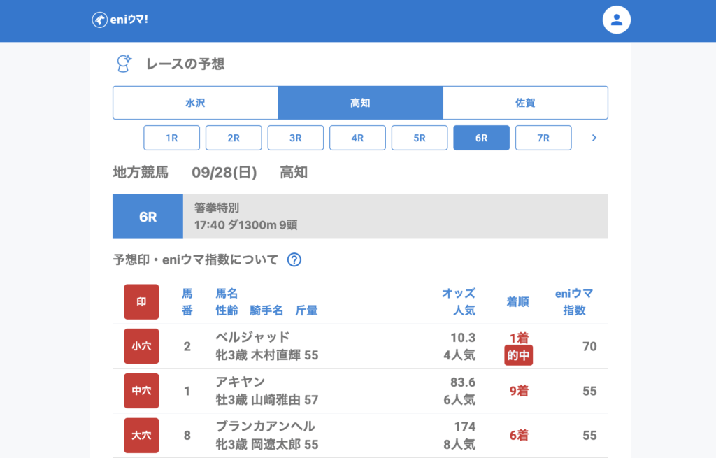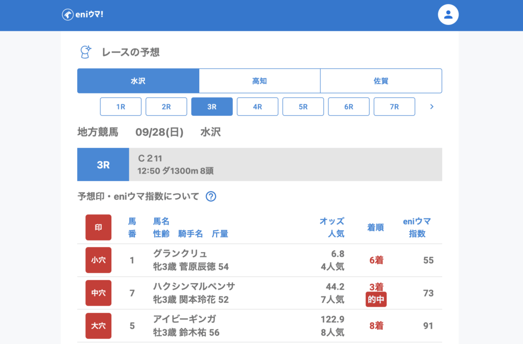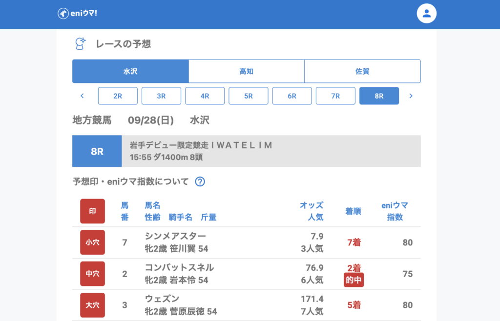 水沢では中穴が5回的中。ティラージュ(48.5倍/eniウマ!指数55)、ハクシンマルペンサ(44.2倍/指数73)など3着的中が多い中、コンバットスネル(76.9倍/指数75)が2着に入り、大きな妙味を残しました。