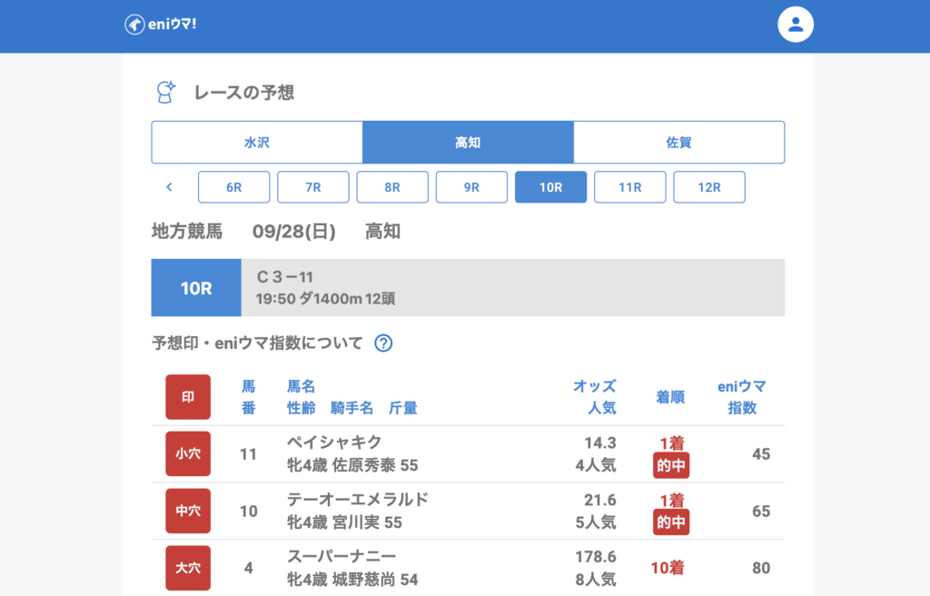 高知では昨日に続き、小穴の的中が7回あり、そのうち単勝が6回的中と安定感を発揮。特に10Rでは1位が同着となり、推奨していたテーオーエメラルド(21.6倍/指数65)とペイシャキク(14.3倍/指数45)の2頭が揃って的中しました。