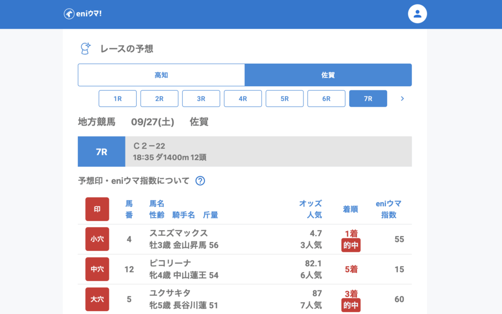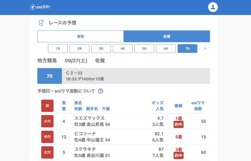 佐賀競馬場では4Rでマイネルタイムリー(26.6倍/eniウマ!指数65)、7Rではユクサキタ(87.0倍/eniウマ!指数60)を的中。
