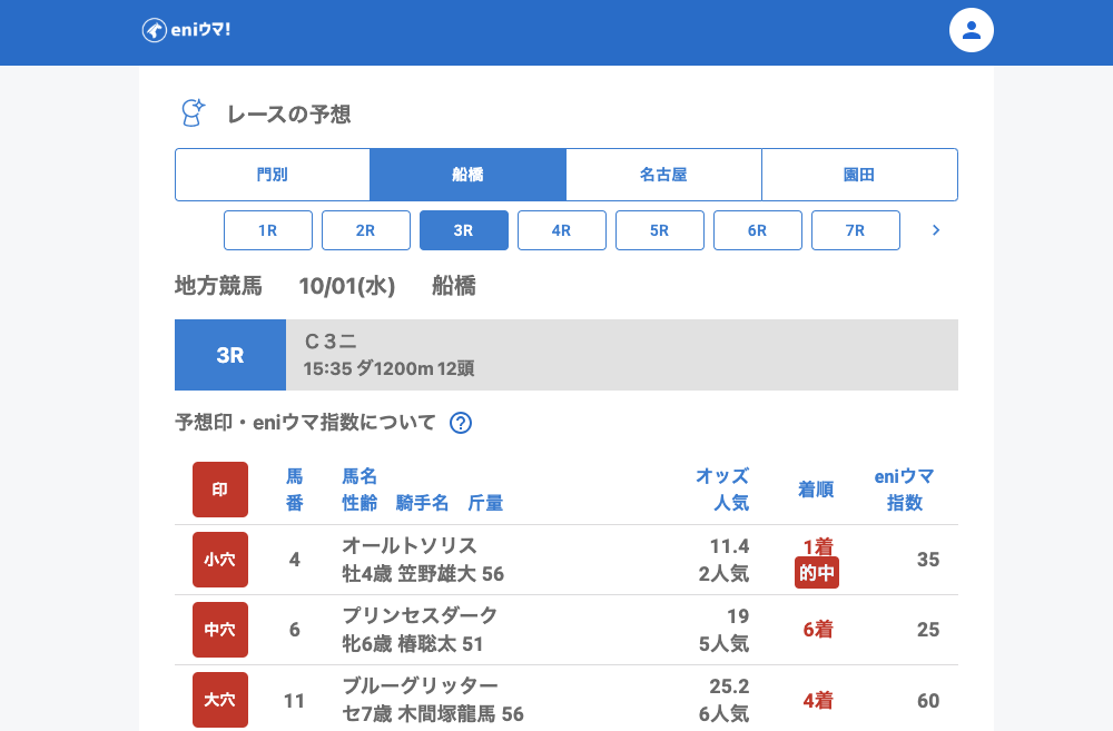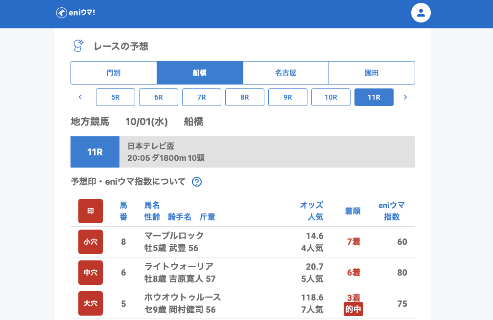 船橋では1Rから単勝的中し、4Rではオールトソリス(11.4倍/eniウマ!指数35)が勝利。合計4回的中と安定感ある結果に。さらに注目のメイン・日本テレビ盃では、1人気フォーエバーヤング、2人気レヴォントゥレットに続き、大穴ホウオウトゥルース(118.6倍/eniウマ!指数75)が3着に入り、配当妙味を大きく押し上げました。