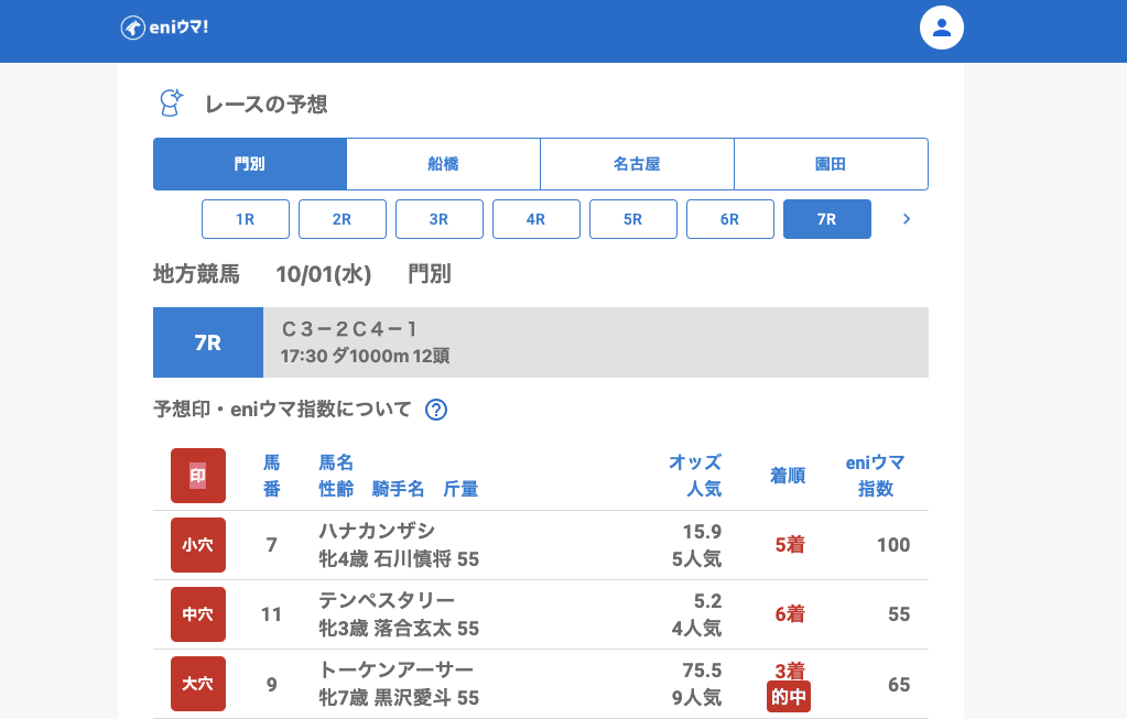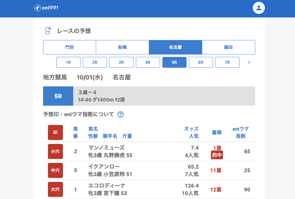 名古屋では小穴推奨馬が3回単勝的中。マンノミューズ(7.4倍/eniウマ!指数65)、ブラックティンカー(5.3倍/eniウマ!指数25)などが堅実に走り、さらにネオシャングリラ(24.9倍/eniウマ!指数65)が3着と見せ場を作りました。
