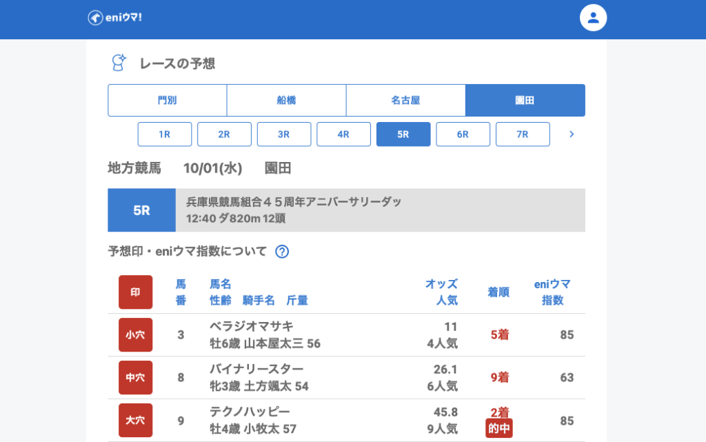 園田では小穴が8回的中。その中でジーニアスレノン(8.8倍/eniウマ!指数75)、テーオーパーソナル(4.9倍/eniウマ!指数45)らが結果を残し、合計3回単勝的中。さらに5Rでは大穴テクノハッピー(45.8倍/eniウマ!指数85)が2着に入り、こちらも注目の的となりました。