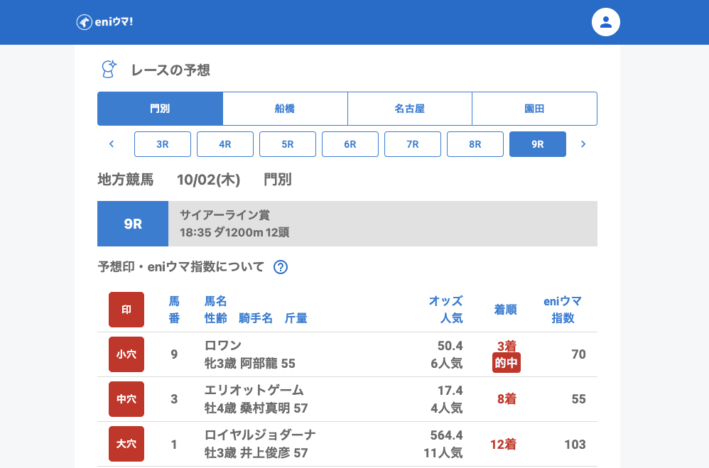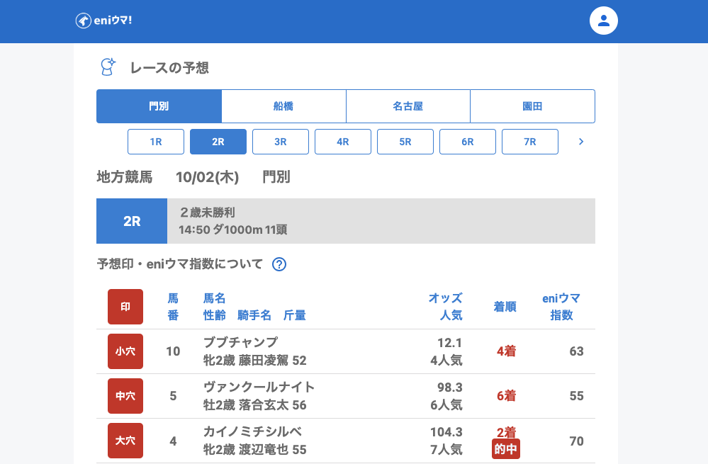 門別では2Rで大穴カイノミチシルベ(104.3倍/eniウマ!指数70)が2着に激走。