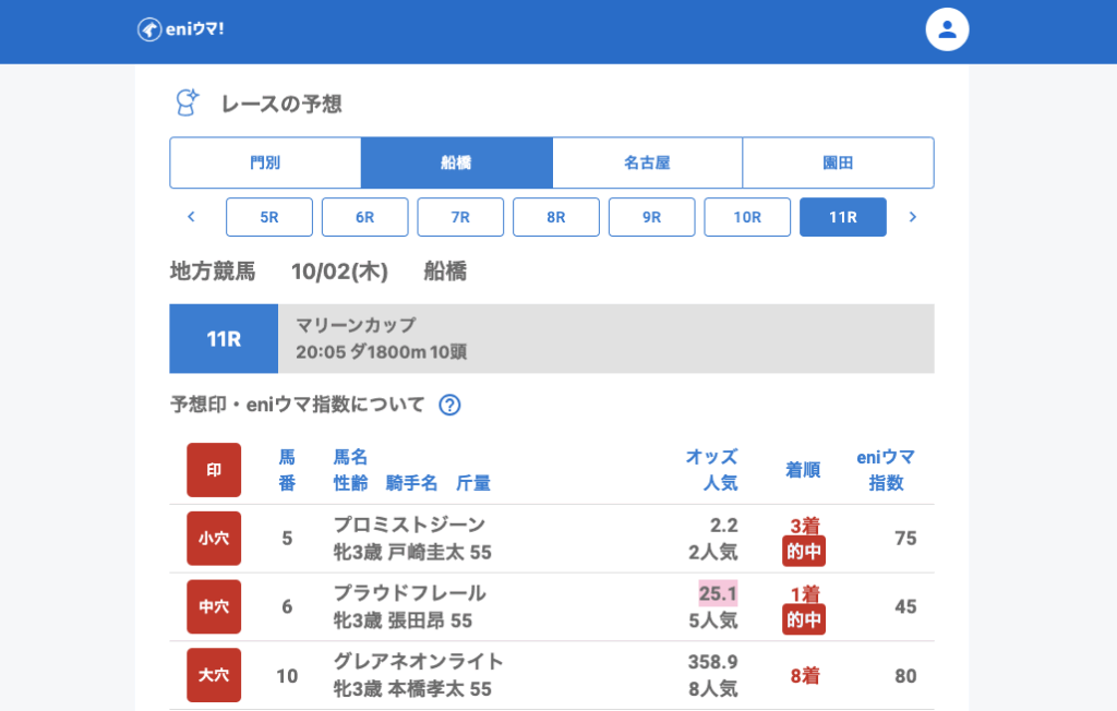 船橋では注目のメインレース・マリーンカップで中穴推奨のプラウドフレール(25.1倍/指数45)が見事1着。続く12Rでもマキシマムパワー(9.0倍/指数95)が単勝的中し、2日続けて好成績となりました。