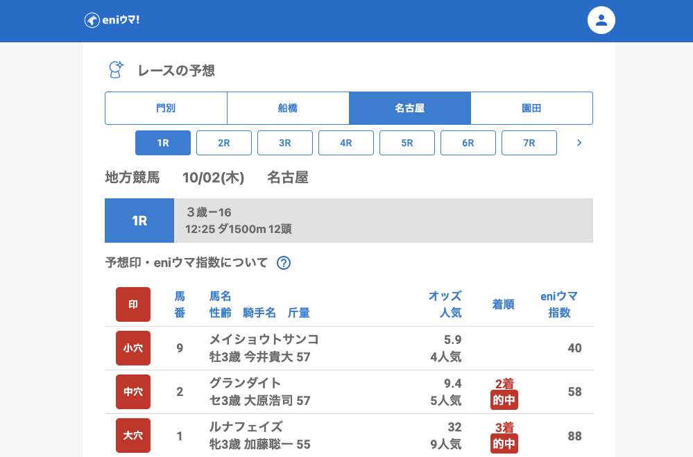 名古屋は序盤から絶好調。1R・2Rではダブル的中、3R・4Rでも小穴単勝が決まり、終盤にはアルティメイタム(7.5倍/指数75)が単勝的中。安定感ある内容でした。