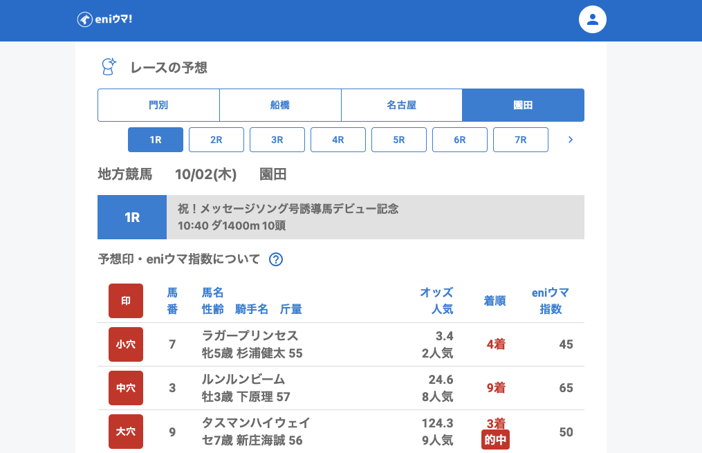 園田でも波乱含みの展開に。1Rで大穴タスマンハイウェイ(124.3倍/指数50)が3着に入り、中穴も合計8回的中と妙味ある結果を残しました。