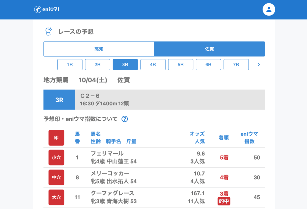 特に佐賀3Rでは大穴クーファグレース(167.1倍/eniウマ!指数45)が的中!