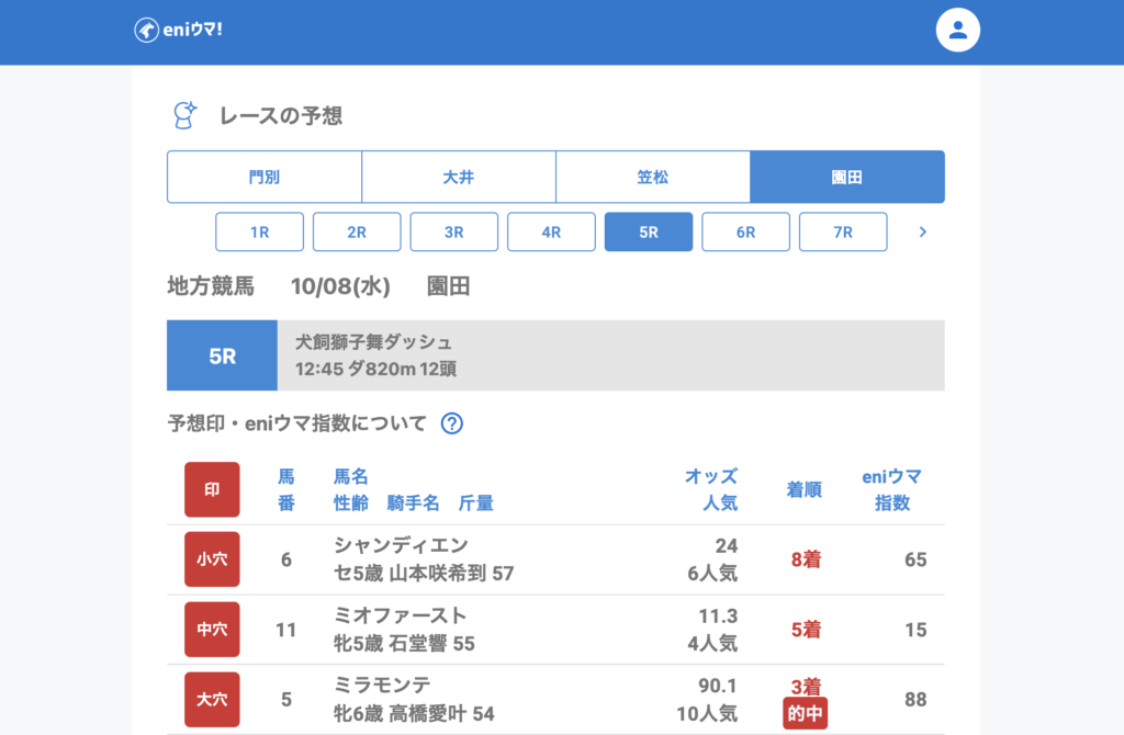 園田では5Rで大穴ミラモンテ(90.1倍/eniウマ!指数88)が3着。