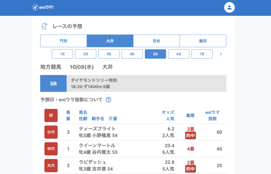 大井は1Rのホウライショウ(30.7倍/eniウマ!指数53)が2着と好スタート。