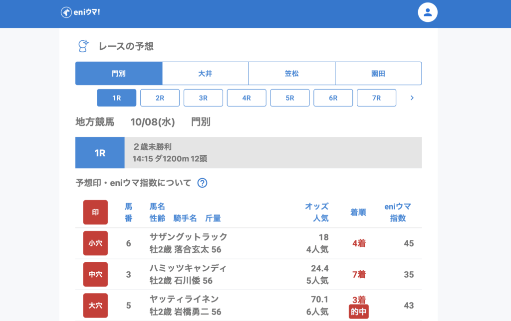 門別では、1Rから大穴ヤッティライネン(70.1倍/eniウマ!指数43)が3着。