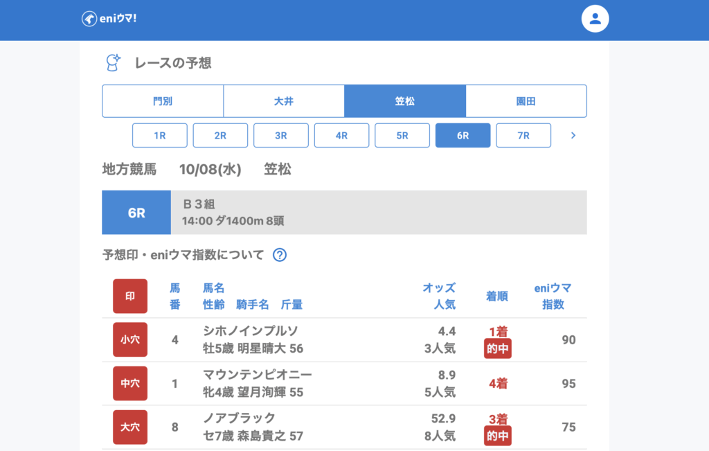 笠松では6Rのノアブラック(52.9倍/eniウマ!指数75)が3着。