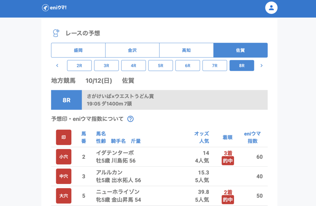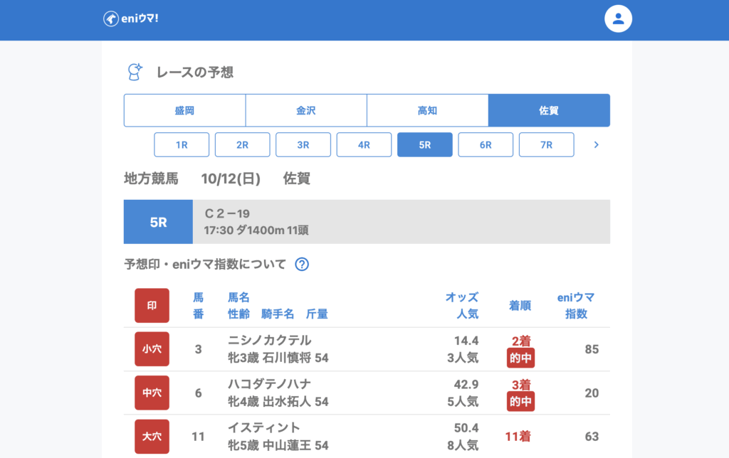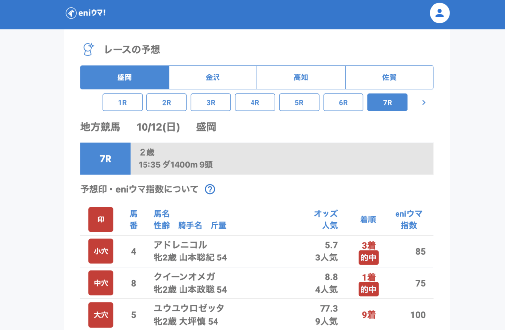 推奨馬が競争除外したレースもありながら、ハコダテノハナ(42.9倍/eniウマ!指数20)やニューホライゾン(39.8倍/eniウマ!指数50)など、人気薄の激走をしっかり捉えました。
