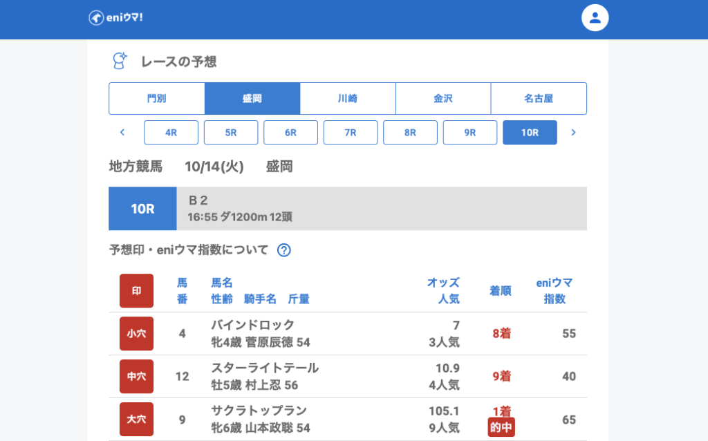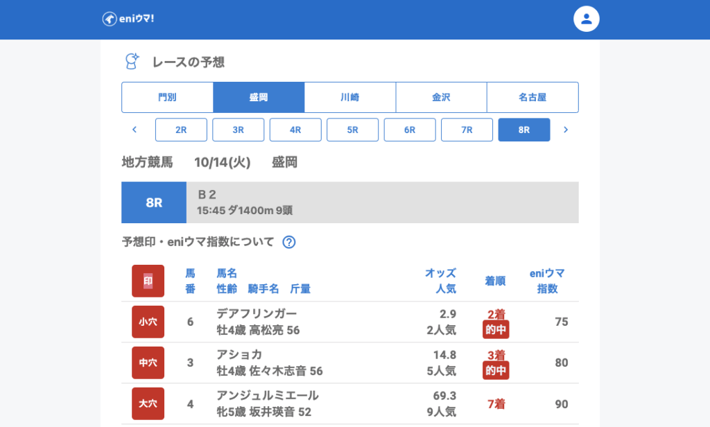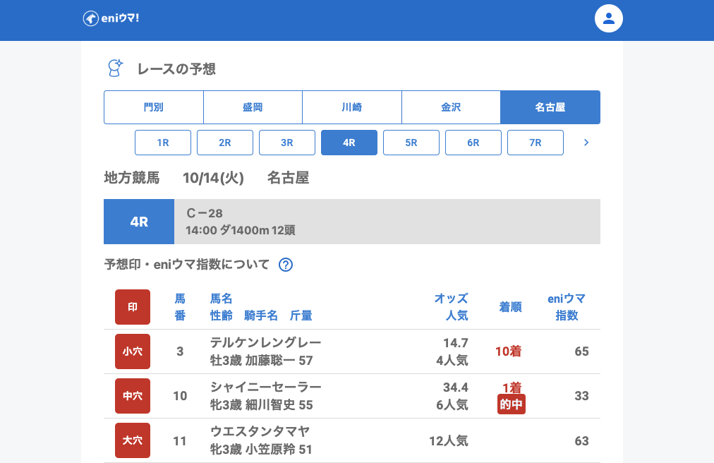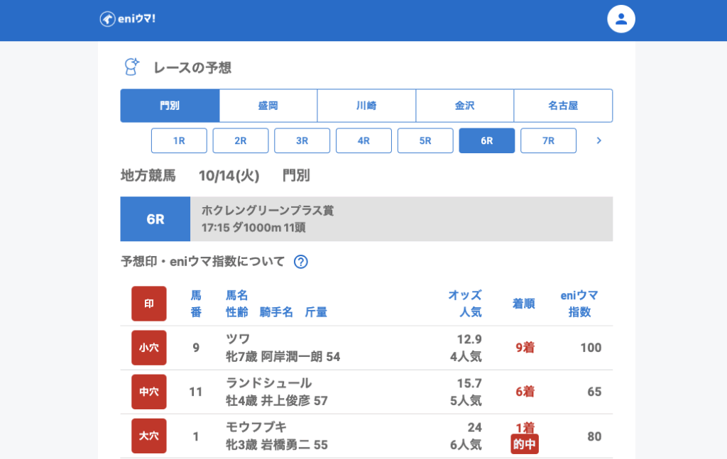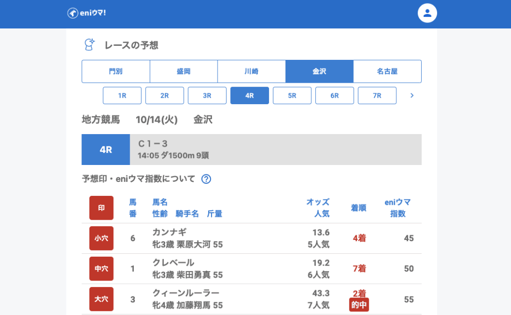 さらに4Rのクィーンルーラー(43.3倍/eniウマ!指数55)や7Rのナイトアウェイ(61.6倍/eniウマ!指数125)も馬券内に食い込みました。