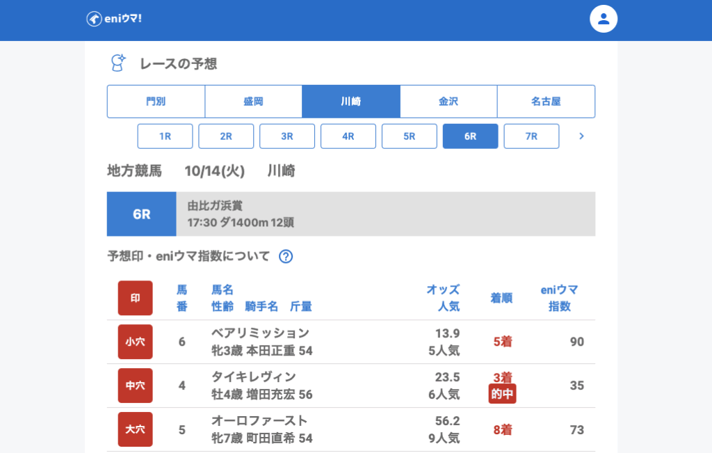6Rではタイキレヴィン(23.5倍/eniウマ!指数35)が2着に入り、着実に推奨馬が馬券内を確保しました。