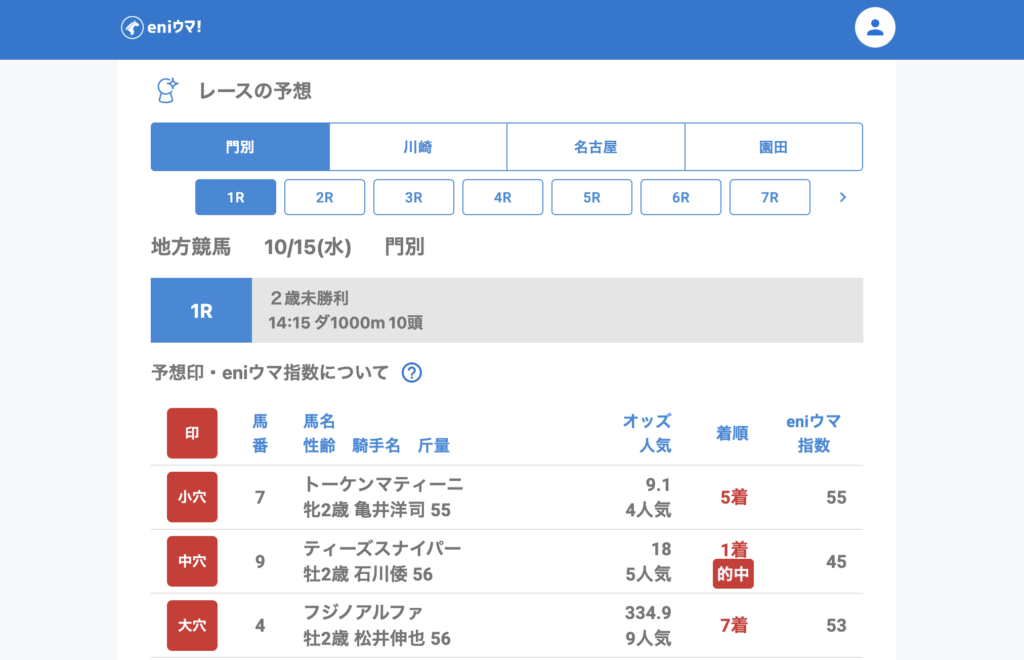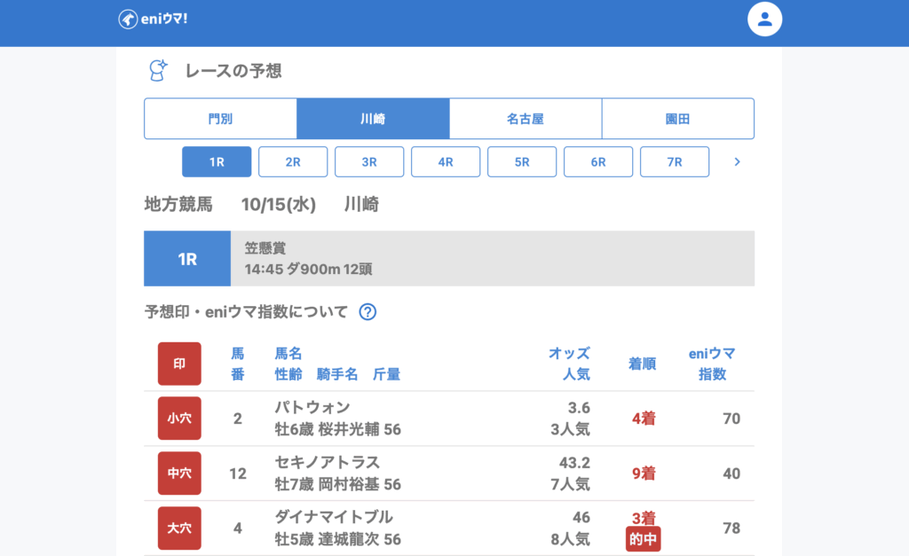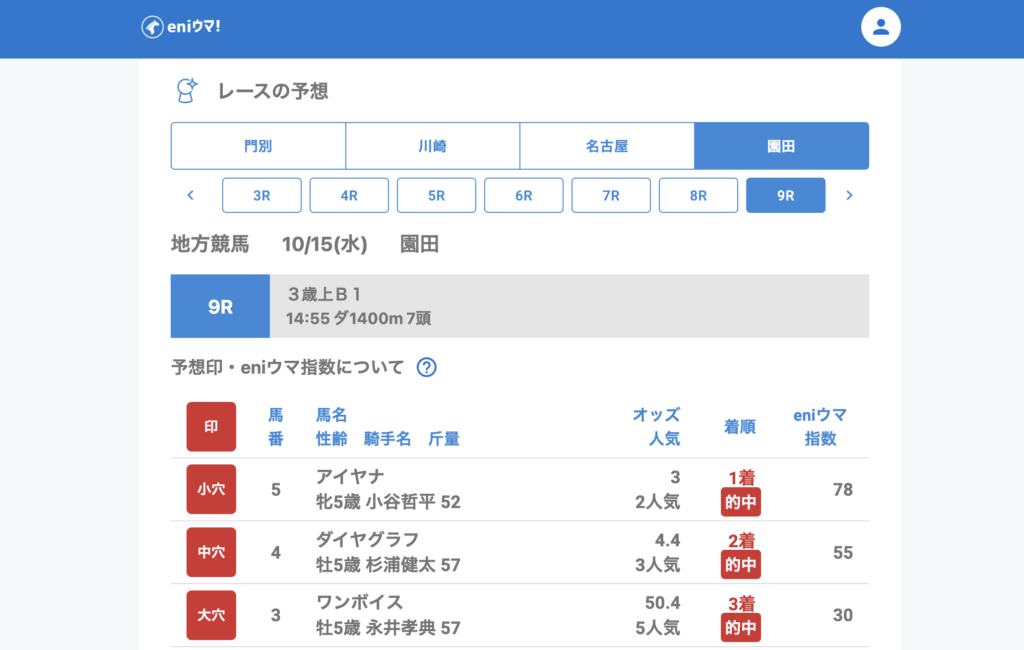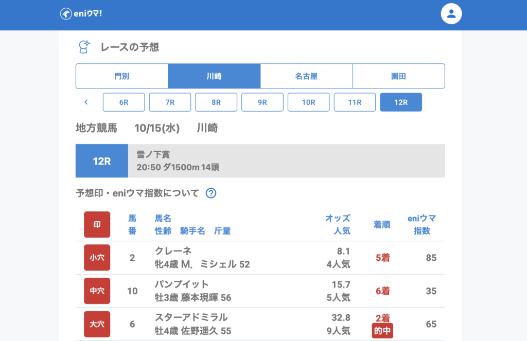 1Rのダイナマイトブル(46.0倍/eniウマ!指数78)が3着、最終レースではスターアドミラル(32.8倍/eniウマ!指数65)が2着と、大穴をしっかりと拾いました。