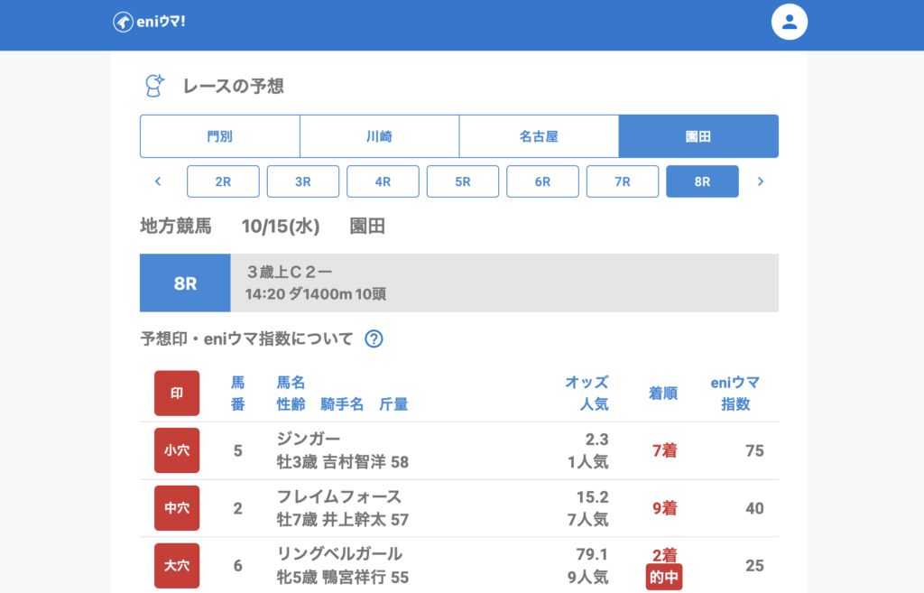 名古屋ではフジュム(13.3倍/eniウマ!指数75)が単勝的中。