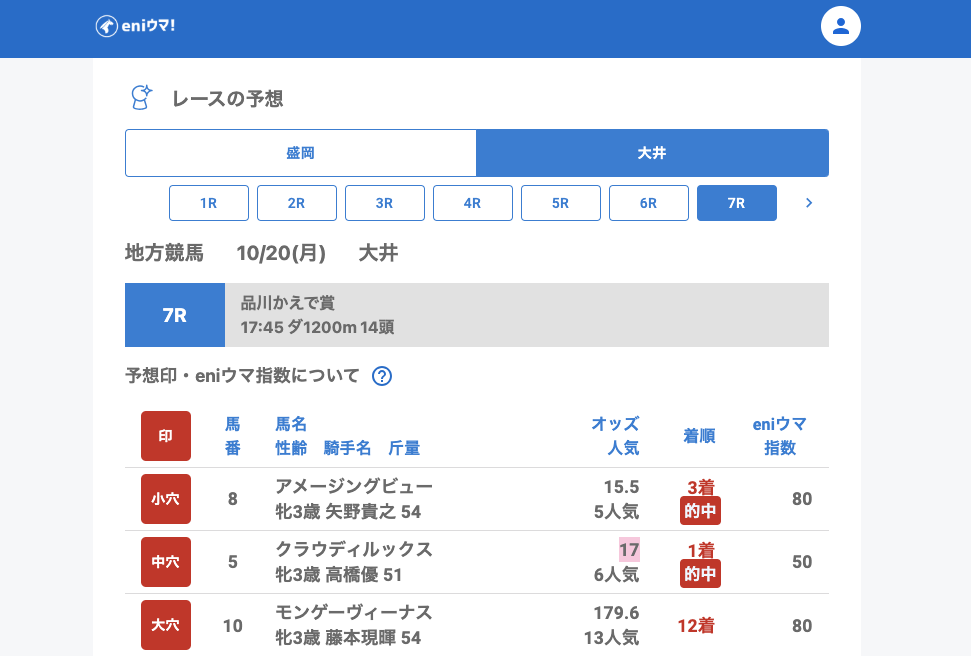 3Rではブイスリー(13.0倍/eniウマ!指数70)、7Rではクラウディルックス(17.0倍/eniウマ!指数50)が単勝的中。