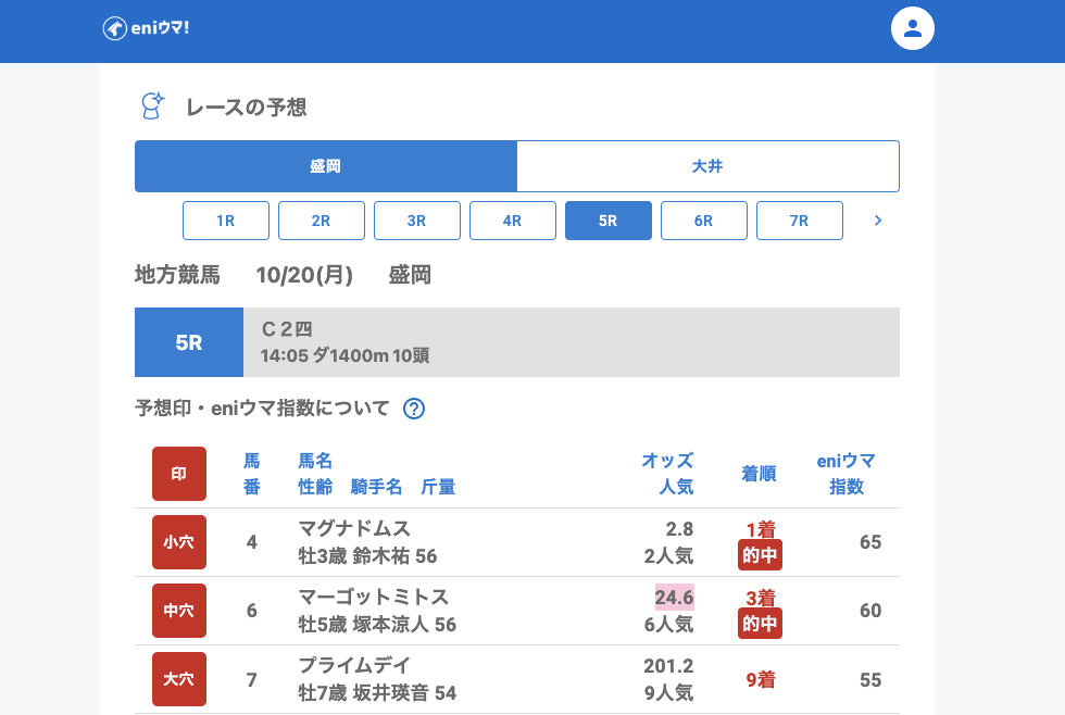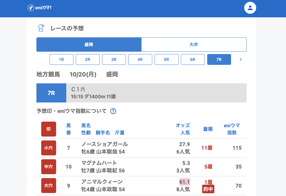 その中でも7Rでは大穴アニマルクィーン(61.1倍/eniウマ!指数70)が単勝的中し、