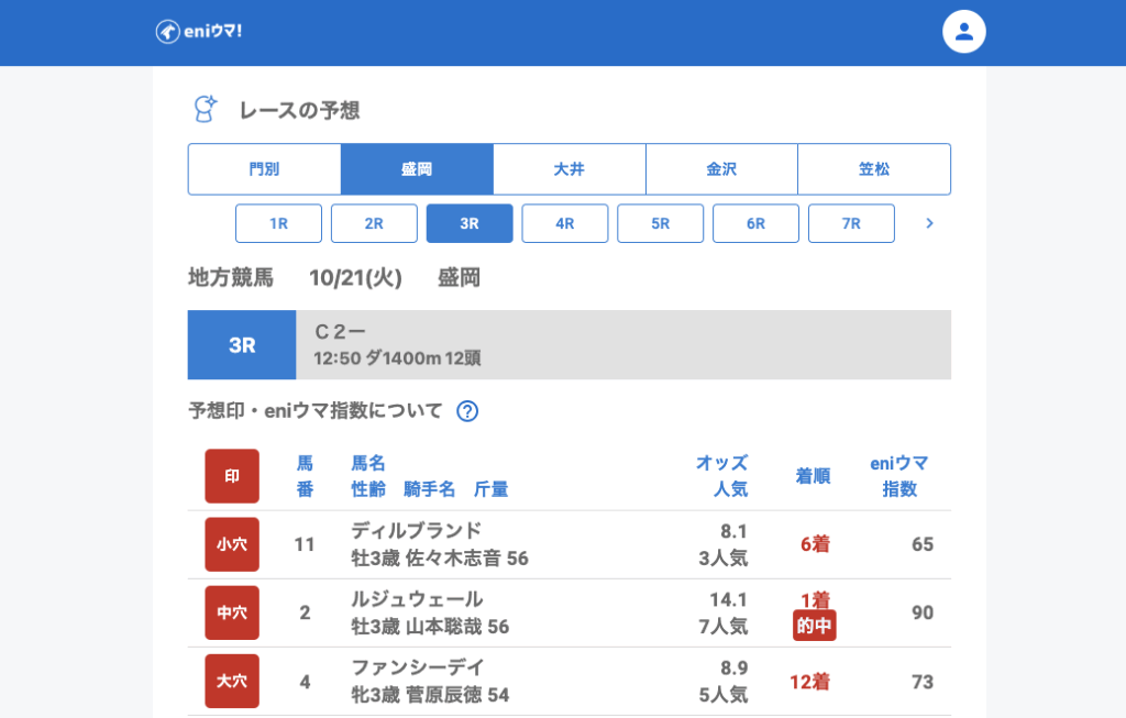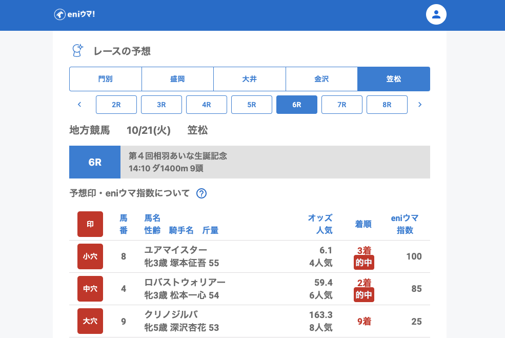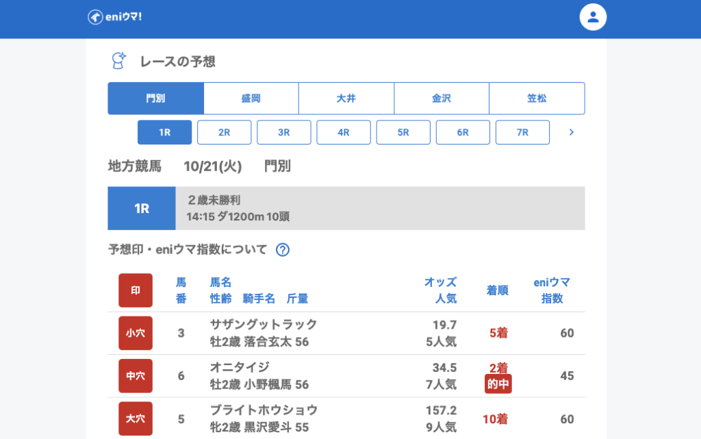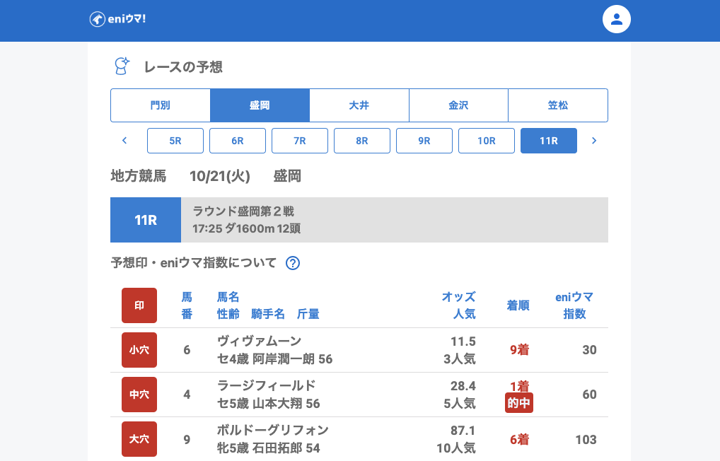 中穴オニタイジ(34.5倍/eniウマ!指数45)や大穴リンクルリンク(37.1倍/eniウマ!指数70)を筆頭に、中穴・大穴で複数的中。