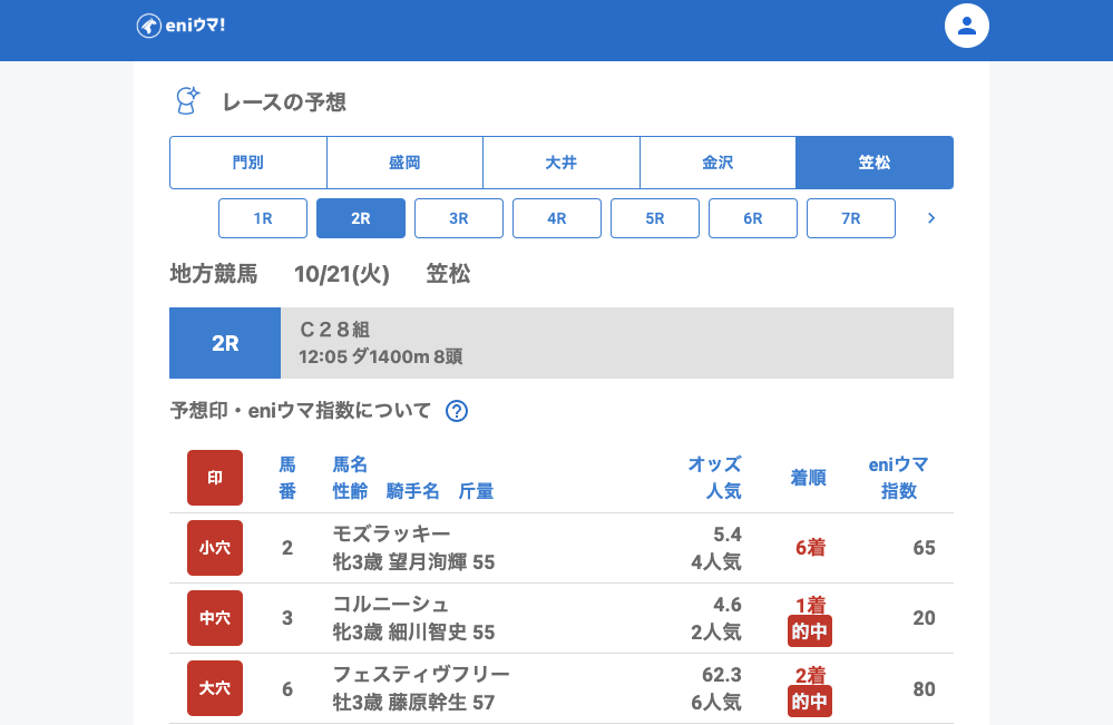 笠松は大穴フェスティヴフリー(62.3倍/eniウマ!指数80)が的中。