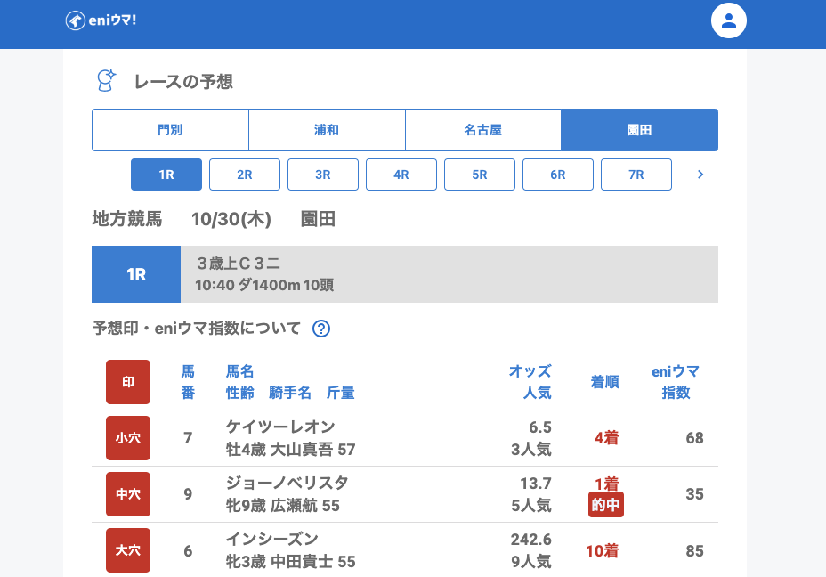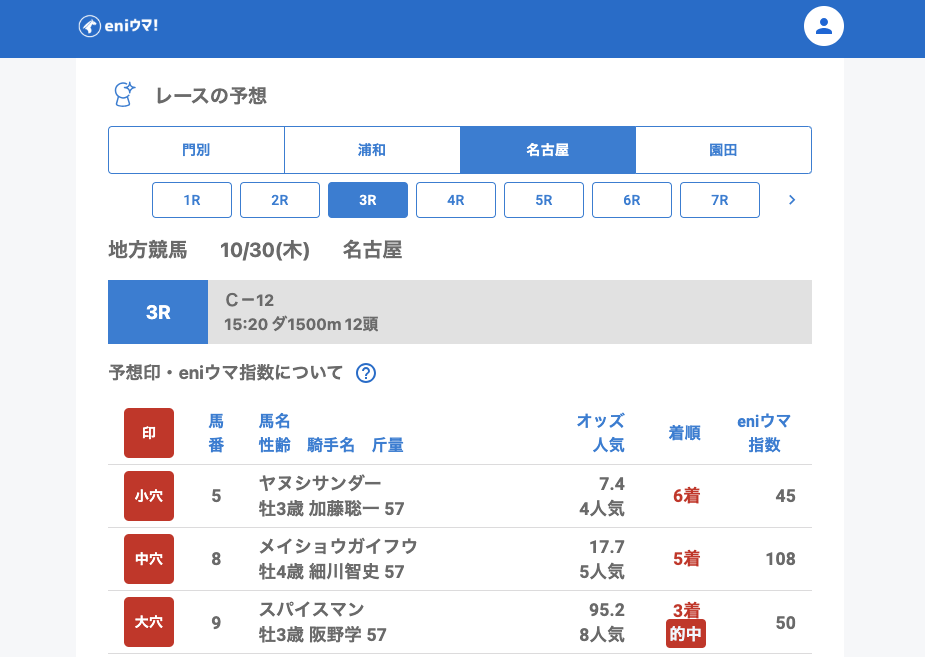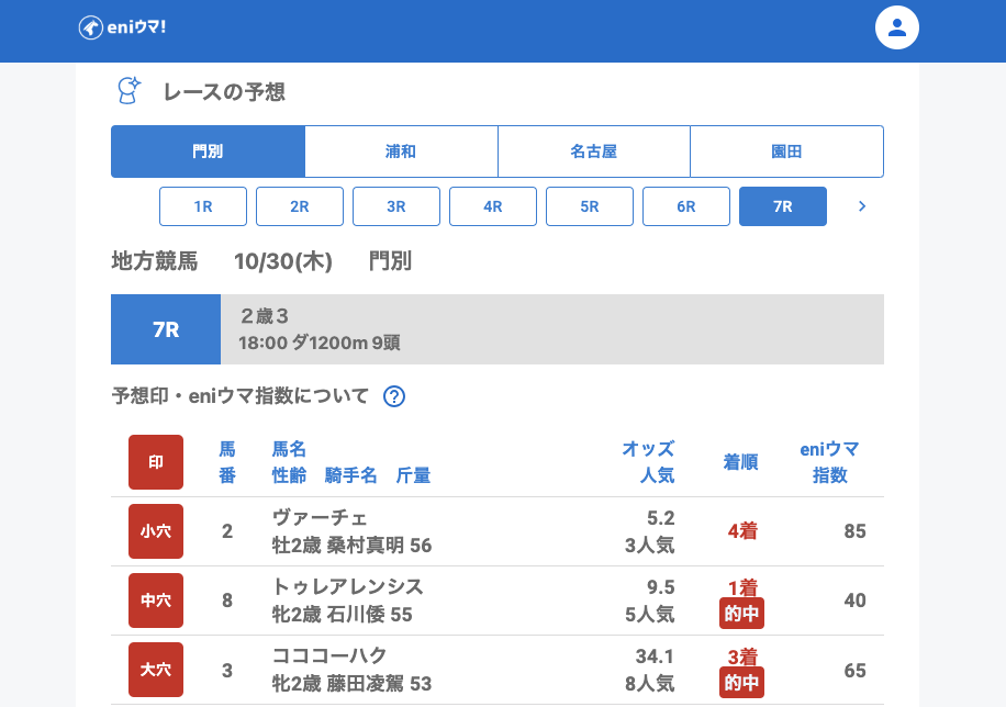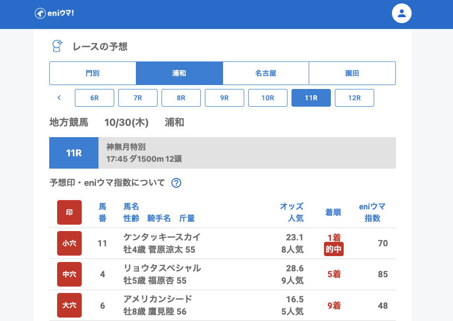 浦和では、大穴ホワイトジェイド(42.4倍/eniウマ!指数58)やファンファン(21.0倍/eniウマ!指数80)を的中。