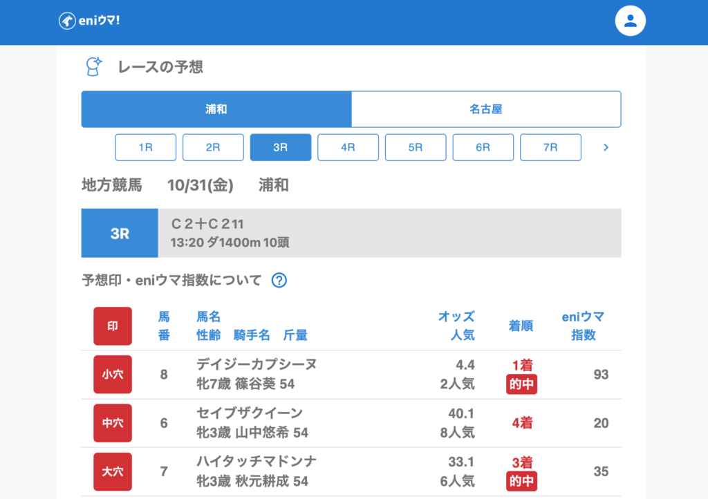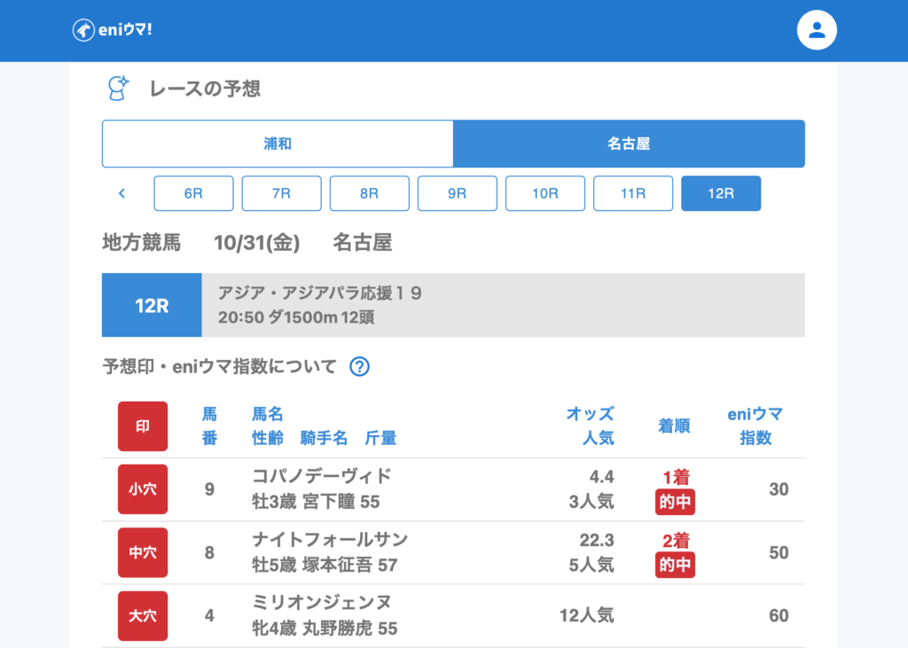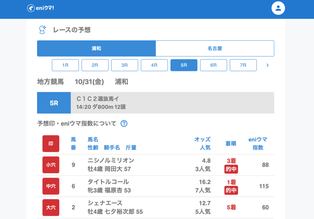 なかでも5Rでタイトルコール(16.2倍/eniウマ!指数115)とニシノルミリオンのダブル的中を達成。