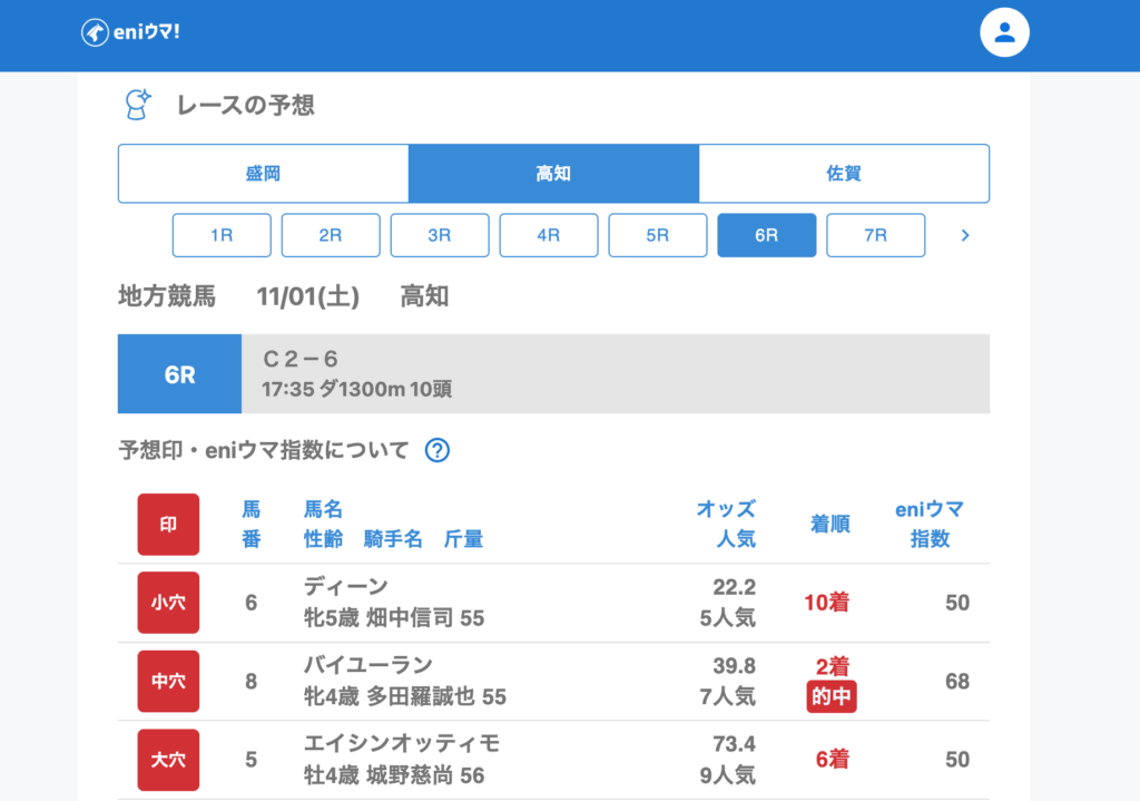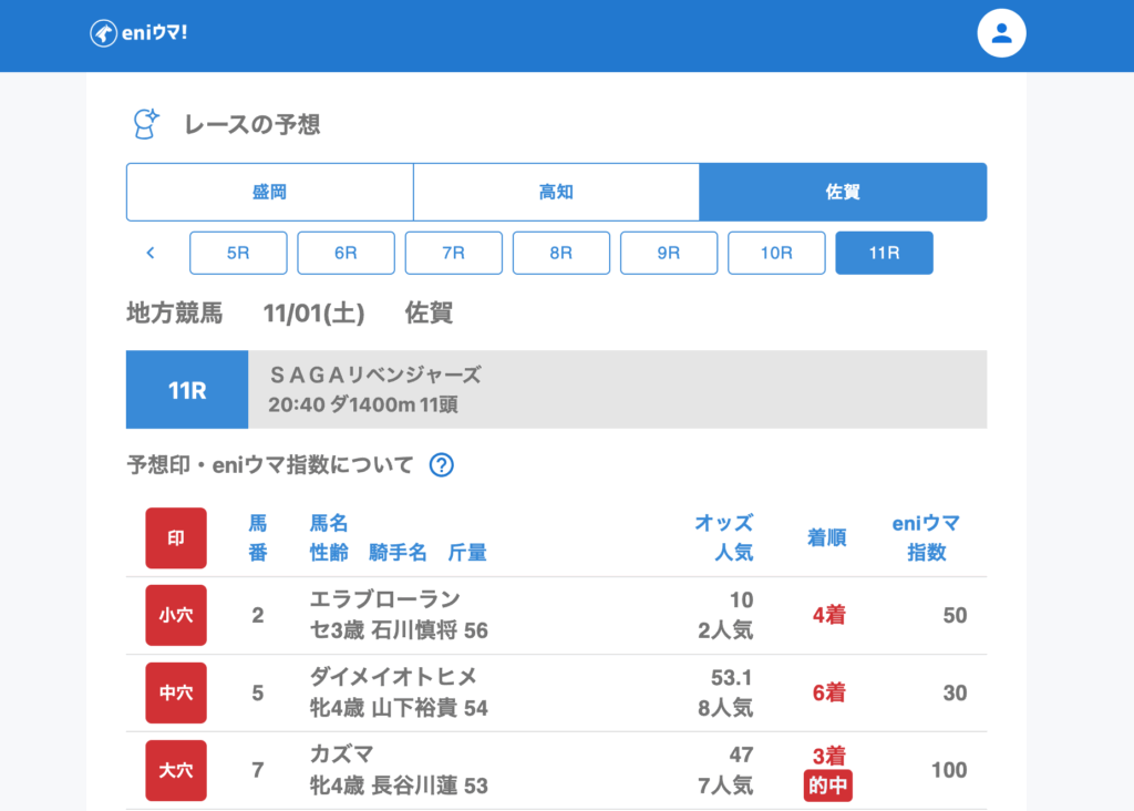 さらに佐賀リベンジャーズでは、カズマ(47.0倍/eniウマ!指数100)を見事的中させるなど、