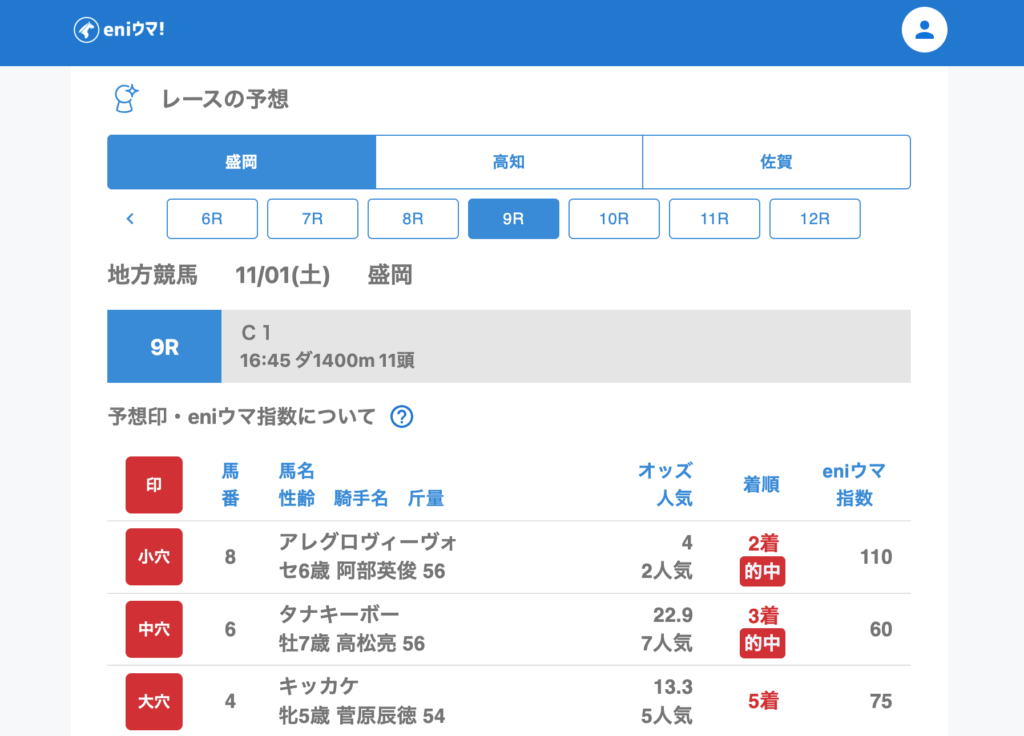 盛岡では、単勝フレイムウィングス(9.1倍/eniウマ!指数78)を的中。