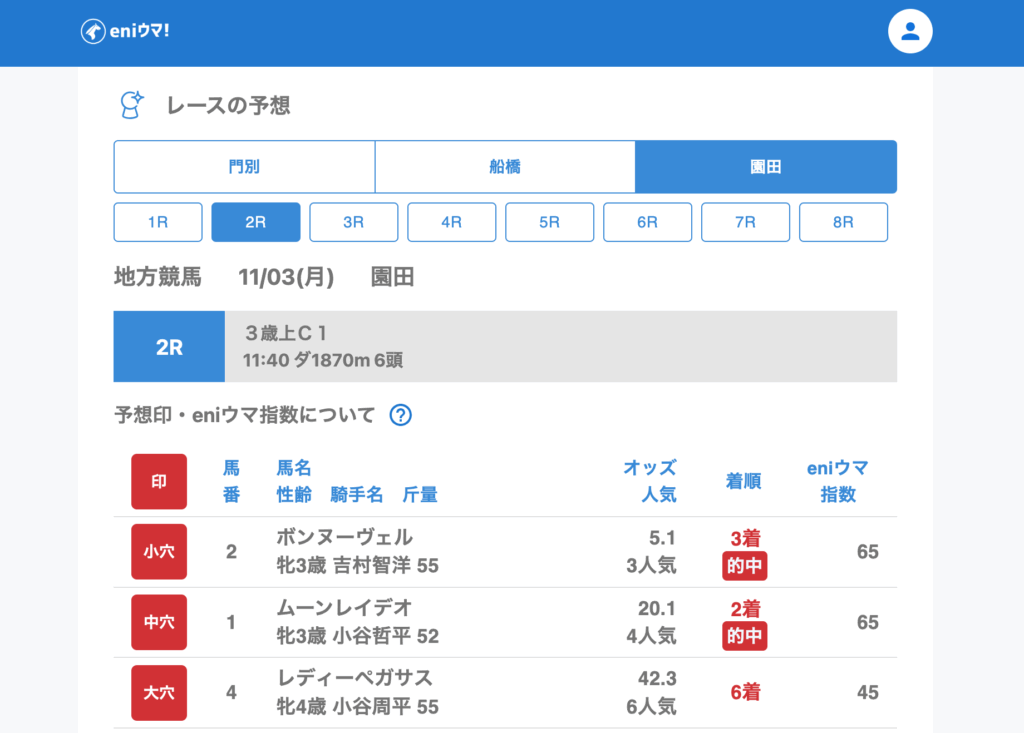 園田では、小穴エクスペリオン(8.8倍/eniウマ!指数65)が単勝で的中。