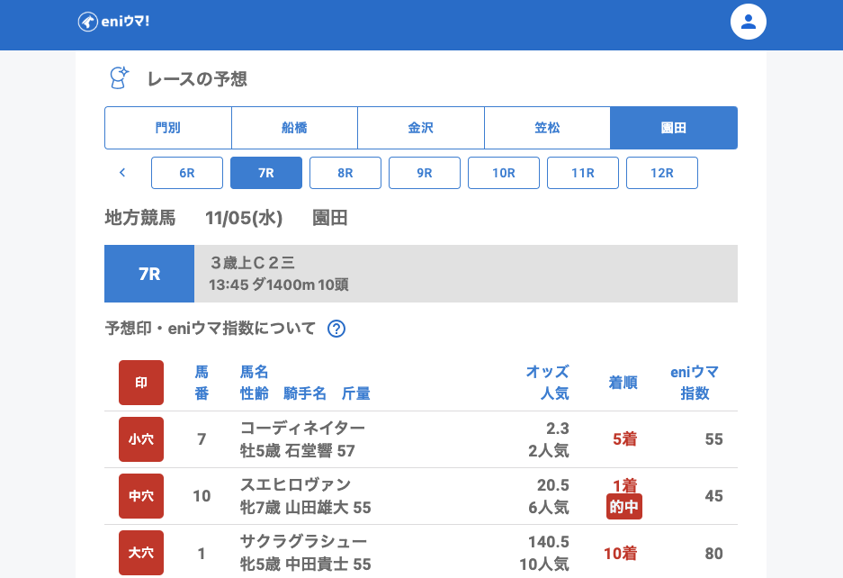 園田ではスエヒロヴァン(20.5倍/eniウマ!指数45)が単勝的中。