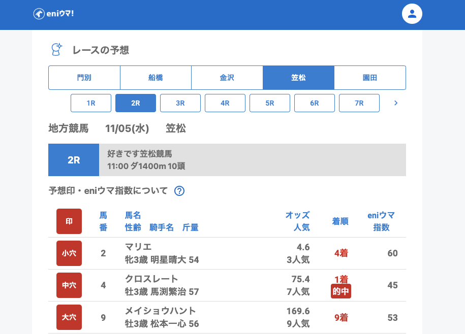 笠松では2Rでクロスレート(75.4倍/eniウマ!指数45)が単勝的中!