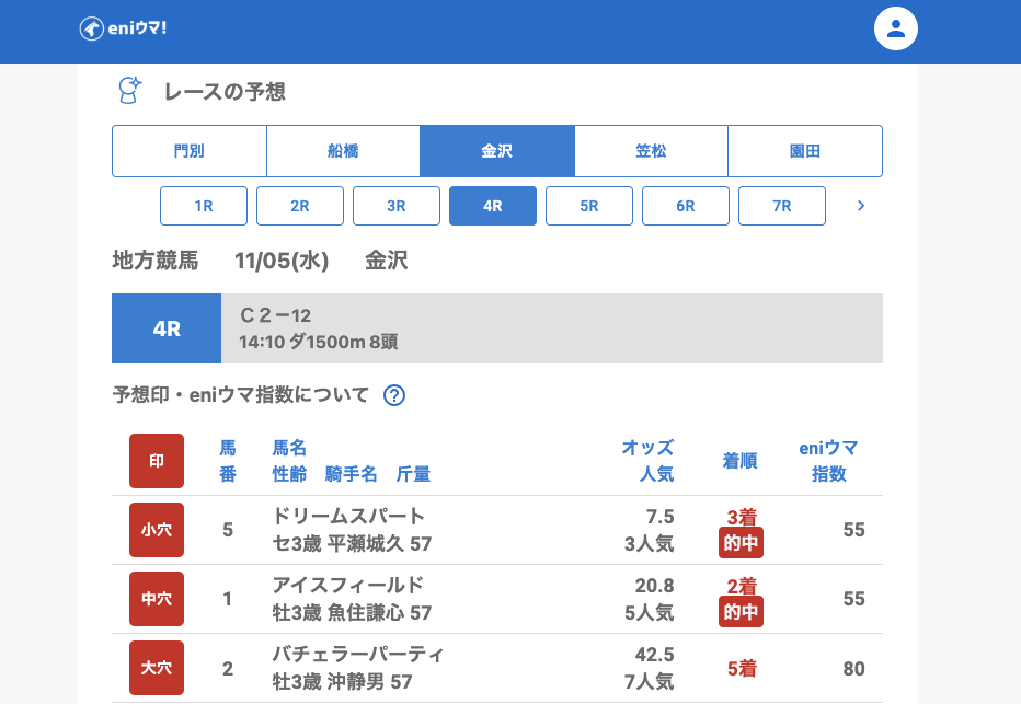 金沢では大穴クラッパーボード(37.0倍/eniウマ!指数60)を筆頭に、