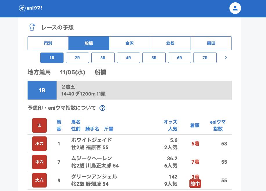 船橋では、1Rで大穴グリーンアンシェル(142.0倍/eniウマ!指数55)を的中!