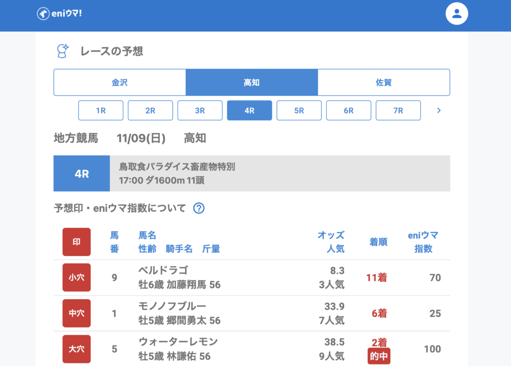さらに高知ファイナルではセージブラッシュ(20.0倍/eniウマ!指数40)を的中し、